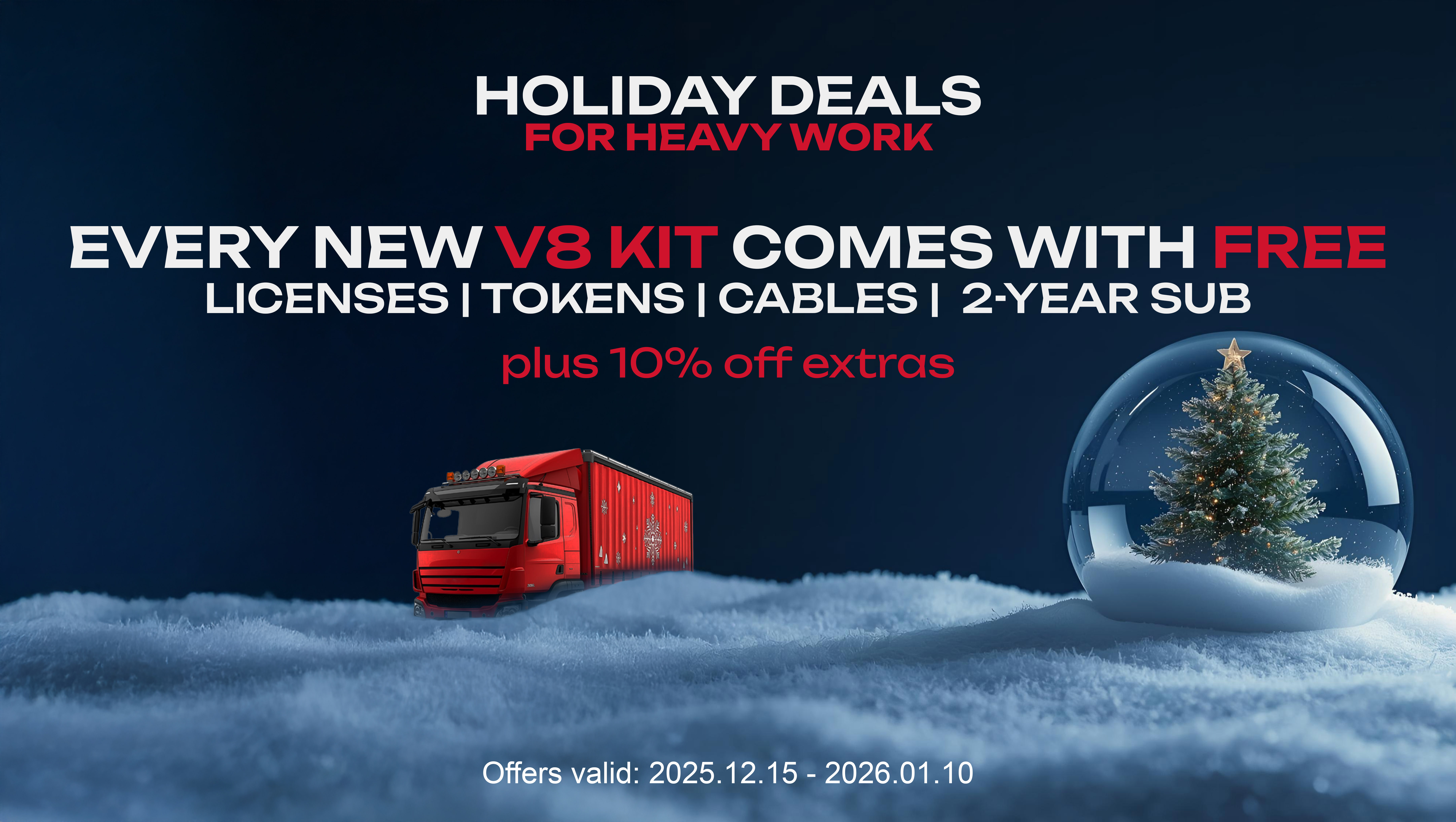 AutoVEI announces a limited-time Holiday Deals campaign for professional workshops working with heavy-duty vehicles. During the campaign period, customers purchasing selected V8 kits will receive additional licenses, tokens, professional cables, and a 1-year update & support subscription, depending on the selected configuration.